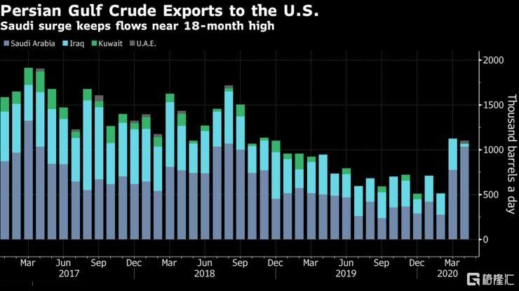 下图显示,因为沙特和阿联酋出口大涨,海湾地区原油出口飙升。