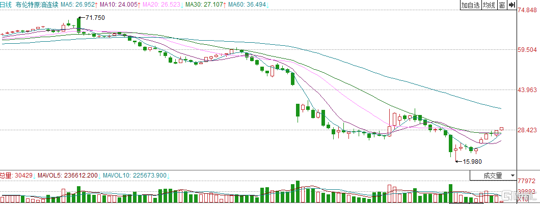 从走势图上看,布油价格在4月22日创下15.98美元低位后反弹,目前已成功突破27美元附近的20日均线。虽然4月份OPEC原油产量飙升,但考虑到OPEC+减产协议5月份生效,加上如疫情得到控制,原油需求反弹仍有希望,布油或进一步测试32.8美元附近的50日均线。
