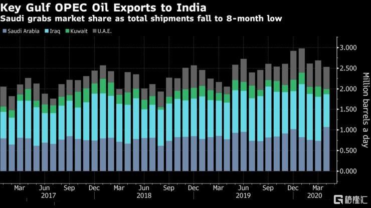 4月份,流入印度的波斯湾原油总量小幅下降。因为沙特下调官方售价,导致原油流量增加了46%,达到至少2017年初以来的最高水平,而伊拉克的出口量则被压缩至近两年来的最低水平。印度的炼油企业正在购入廉价的沙特原油来增加库存,尽管该国的陆上储油罐已装满。