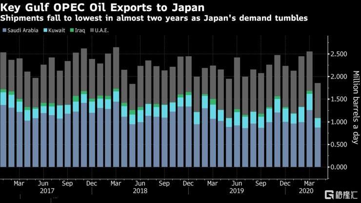 OPEC对日本的原油出口3月份小幅上升后,4月份似乎有所下降。如下图所示,沙特、科威特、伊拉克和阿联酋对日本的原油出口逐月下降,创下了近两年来的最低水平。