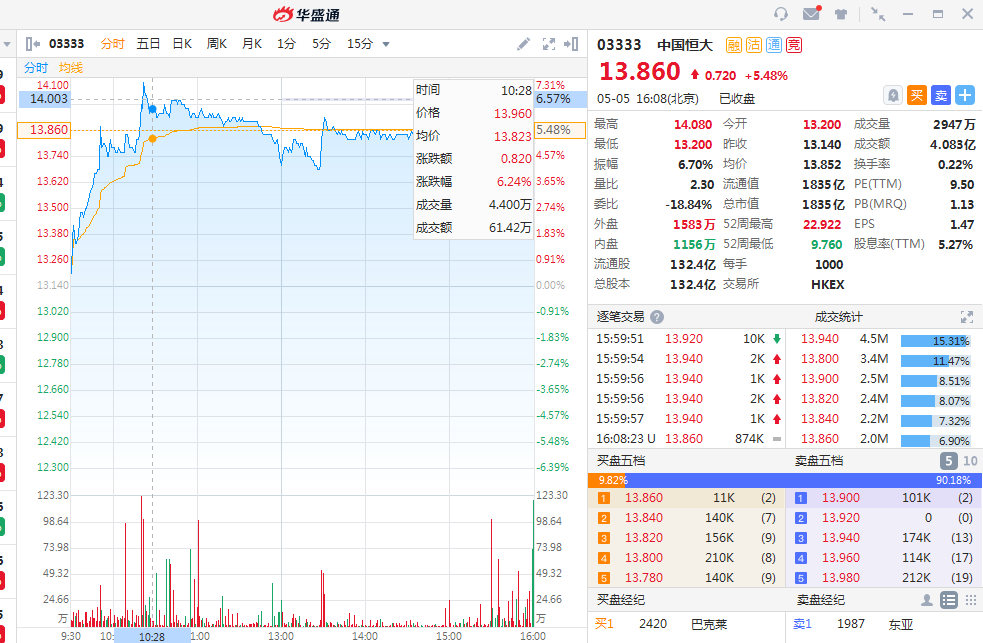 香港万得通讯社报道,中国恒大在港交所披露,5月4日-5日累计回购1181.2万股,耗资约1.57亿港元。中国恒大今日收涨5.48%,股价13.86港元。