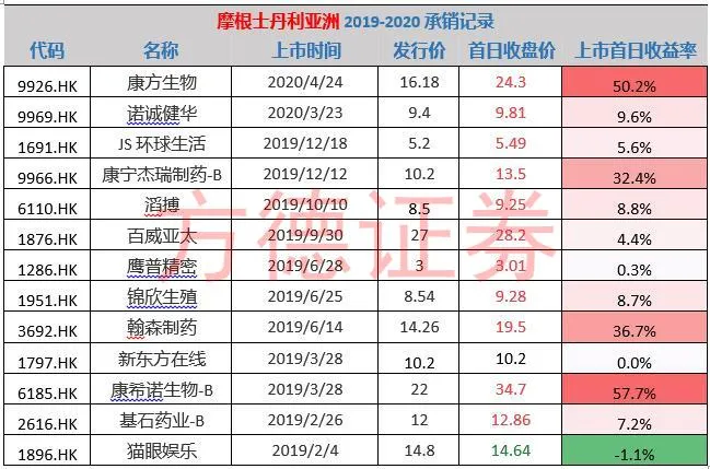 大摩只有一次败绩,两家总计在2019-2020年当中保荐了17家公司,13家录得上涨,一家平,3家小幅下跌1%左右。