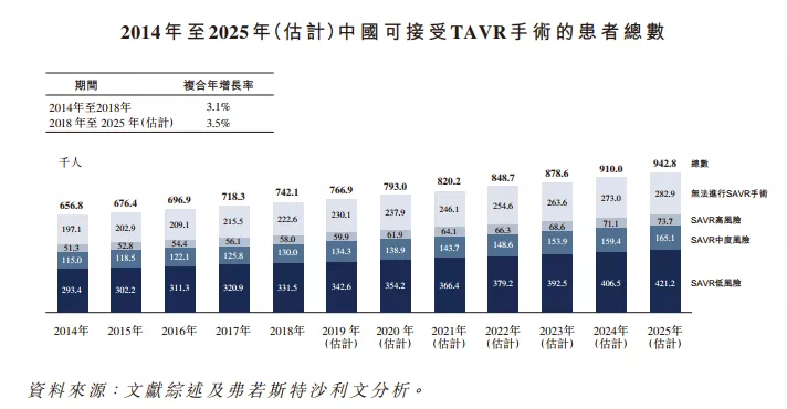 中国可接受TAVR手术的患者人数由2014年的656.8千人增加至2018年的742.1千人,复合年增长率为3.1%,且估计将于2025年进一步增至942.8千人,2018年至2025年的复合年增长率为3.5%。下图显示中国可接受TAVR手术的患者总数: