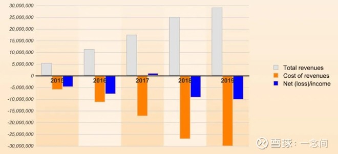 我们看到,从2015年开始,它的成本都远远大于收入,加上其他成本费用,更是连年亏损。2019年收入290亿,亏损103亿。