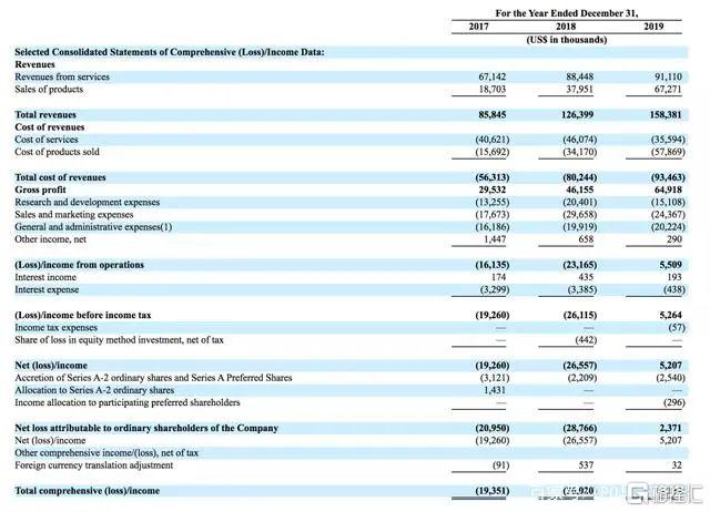 2017年、2018年、2019年收入分别为8580万美元、12640万美元、15840万美元。期内毛利率分别为34.4%、36.5%、41.0%,净利润(亏损)分别为-1930万美元、-2660万美元、520万美元。调整后净利润(亏损)分别为-1370万美元、-2430万美元、540万美元。调整后的息税折旧摊销前利润(EBITDA)分别为-470万美元、-1510万美元、890万美元。2017年、2018年和2019年,从中国境外客户获得的收入占比依次为37.9%、50.9%和67.9%。