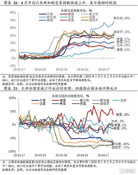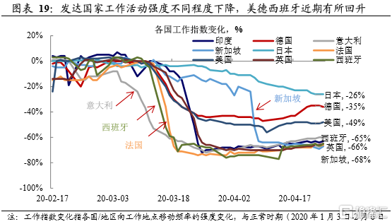 相对而言,日德美工作受疫情影响较小。从影响的幅度来看,欧洲除德国受疫情影响较大,英法西班牙等国工作活动强度普遍受疫情影响下降60%-70%左右。新加坡在近期疫情严重程度上升后工作强度也下降较快,截至4月底降幅达到68%。相对而言,日德美三国工作强度受疫情影响较小,截至4月末降幅分别为26%、35%和49%。