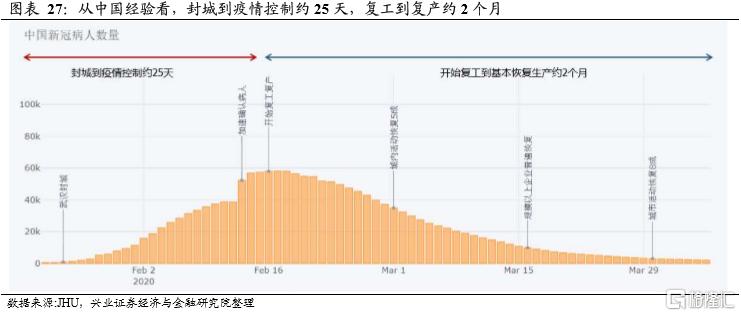 参考中国经验,海外复工到经济完全恢复正常可能仍需1-2个月时间。随着海外发达国家疫情已经过拐点期,欧美国家开始推进复工的政策计划。由于中国的新冠肺炎疫情发展已经历了完整周期,当前经济已基本完全恢复正常,中国的复工复产经验可以作为发达国家的参考。从时间上来看,中国从疫情爆发到2月中旬疫情得到控制用了约25天时间,而从2月16日政府开始逐渐推进复工复产,到4月初生产能力基本恢复用了约2个月的时间。