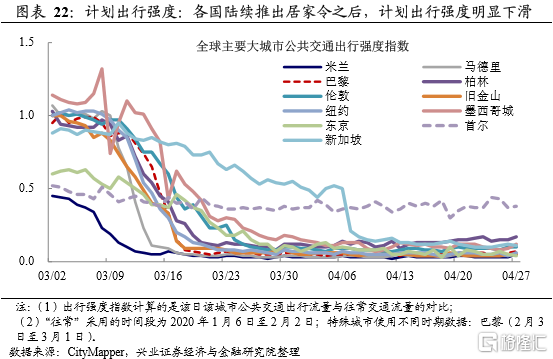 发达国家工作活动强度陆续回落。从各国工作活动强度指数(即流向工作所在地的交通流大小)来看,3月初以来,首先由意大利开始,随后西班牙和法国的工作强度逐渐下降至正常情况的30%,这与我们跟踪的2月份中国经济情景相似。而新加坡在4月份以前工作受疫情影响较小,但从4月6日后开始快速下降,显示了疫情严重后的影响。