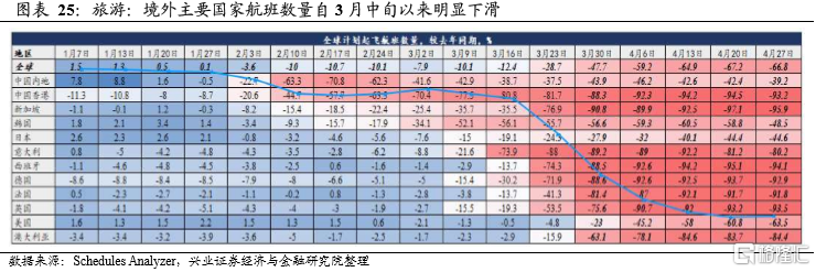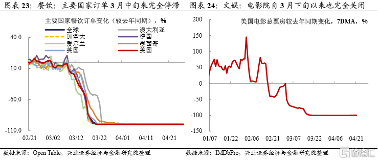 航班、餐饮等高频指标也可以作为辅助参考。除了谷歌活动指数以外,其余新数据的高频指标也可作为辅助参考。从高频数据来看,CityMapper等其他机构对经济活动强调进行统计的数据也指向从意大利和西班牙开始,3月份以来各国的活动处于近停滞状态,近期略有回升。截至4月底,各国和地区航班数量同比明显下降,美国整体下降超60%,欧洲地区整体下降约90%。各国餐饮、电影等数据也处于停滞状态,显示近期欧美国家开始推进复工,经济活动开始出现一些边际变化但目前的改善尚不明显。
