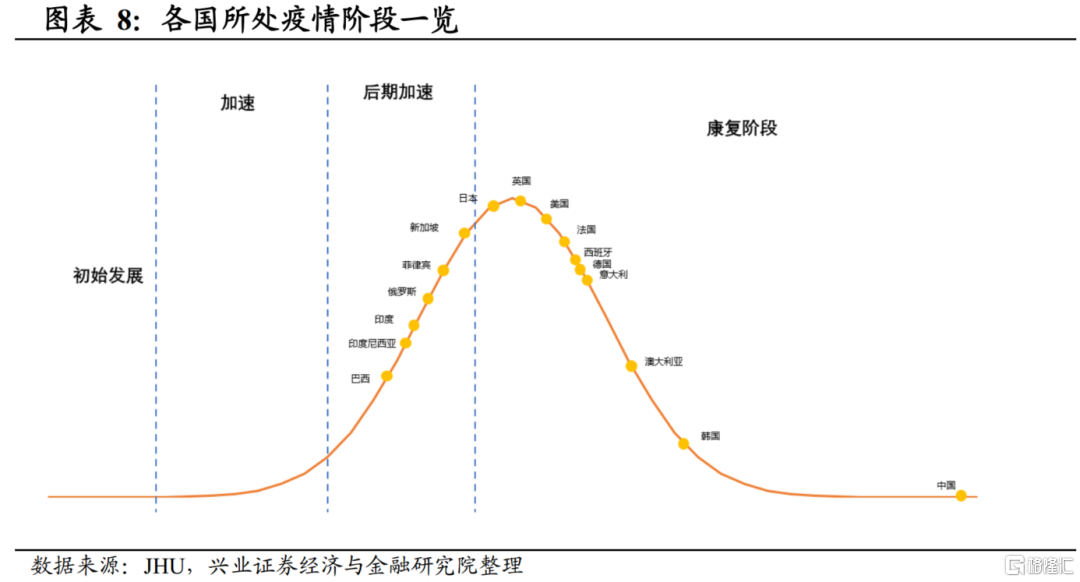 东南亚、南亚、拉美进入疫情快速增长期,新兴市场存在不确定性。相对发达国家而言,新兴市场处于新冠疫情发展的相对前期,俄罗斯、巴西、印度、印尼和菲律宾等新兴市场确诊人数仍处于增长阶段,但随着检测量的增加和管控加强,潜在风险有所回落。但经济相对落后,且检测难以开展的前沿国家,确诊、检测数据缺失,可能存在着较大风险。