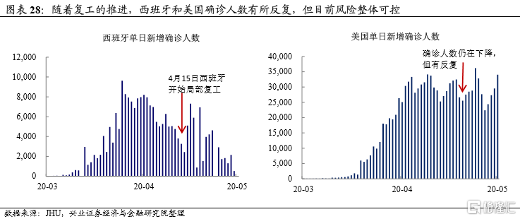 开始推进复工的美国、西班牙疫情确诊出现反复迹象,但风险整体可控。从我们的经济和政策跟踪框架来看,随着发达国家疫情进入平台期,欧美各国开始推进复工复产,近两周美国、德国、西班牙等国经济活动强度已逐渐回升迹象。值得注意的是,近期美国和西班牙新冠疫情确诊人数也出现小幅反弹迹象,或与经济活动的回升相关。但整体而言,疫情反弹幅度整体可控,发达国家疫情的第一波冲击或逐渐过去。