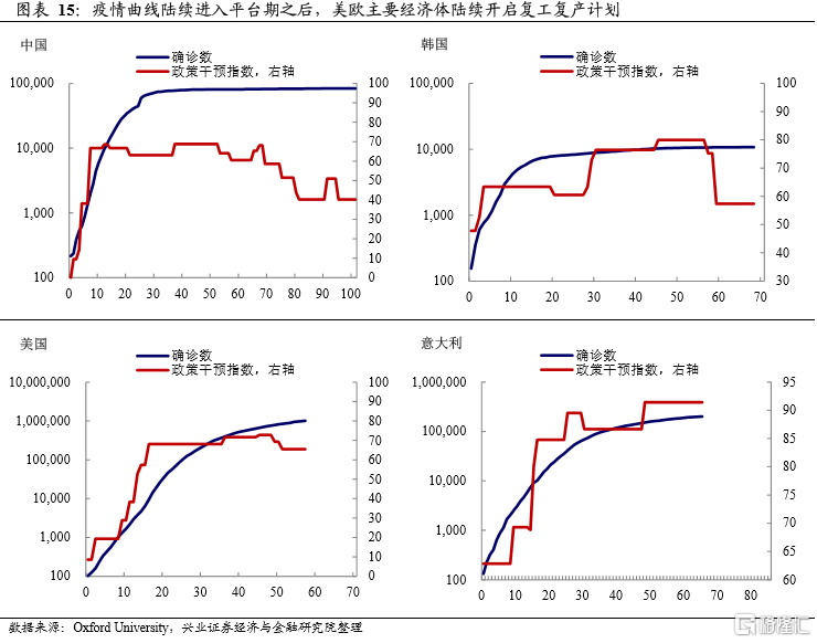 “防疫-经济”平衡木:随着疫情进入拐点,欧美推进复工的政策计划。考虑到应对新冠肺炎疫情“紧急状态”下,实体经济可能遭受的潜在拖累,而在发达经济体现行的政治体制下(尤其考虑到美国今年是大选年),社会对于“抗疫的经济代价”容忍度实际上可能是相对偏低的。因此,在美欧主要经济体疫情曲线陆续进入平台期之后,政府开始启动复工复产计划。对于复工复产政策层面的追踪,我们也有定性和定量两个维度的跟踪变量。