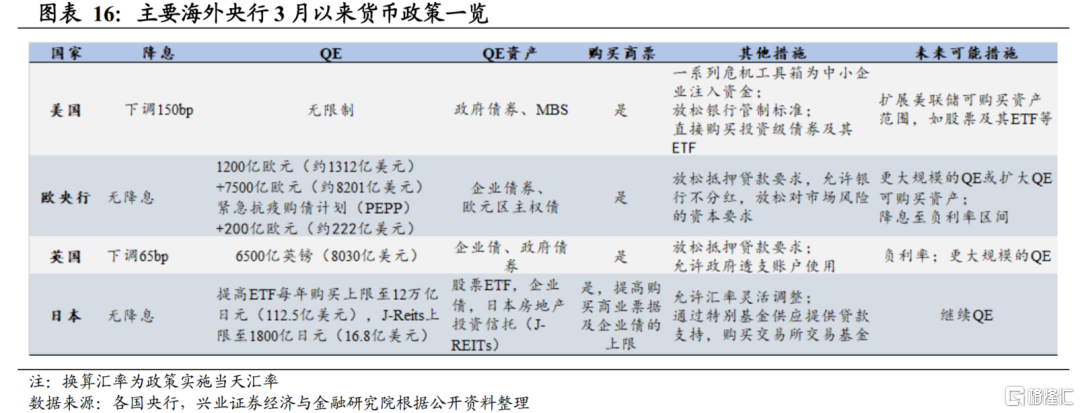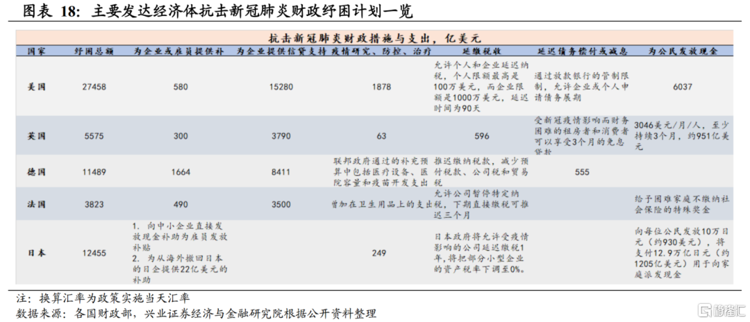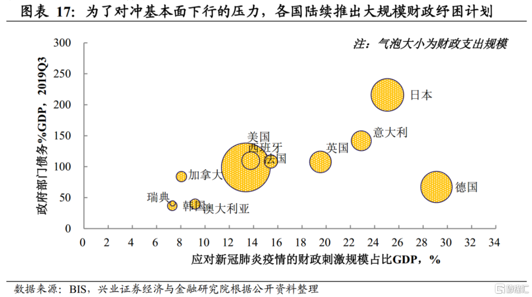 除了“防疫”政策,各国陆续推出货币财政刺激对冲基本面下行压力。除了疫情防控政策,为了对冲疫情疫情对需求的负面冲击以及“抗疫”的经济代价,各国陆续加大宏观政策调控力度来对冲实体经济和金融市场受到的负面冲击。货币政策方面,各国央行投放大幅流动性,缓解金融机构的流动性匮乏和中小企业资金链断裂的风险。而考虑到企业和居民因疫情以及停产停工所受的损失,单靠货币政策无法解决的。各国也陆续推出了在货币政策配合下的大规模财政纾困计划,包括建立专项医疗基金、为雇员提供收入补助、为企业提供信贷支持、延迟税收、直接向公民发放现金等。