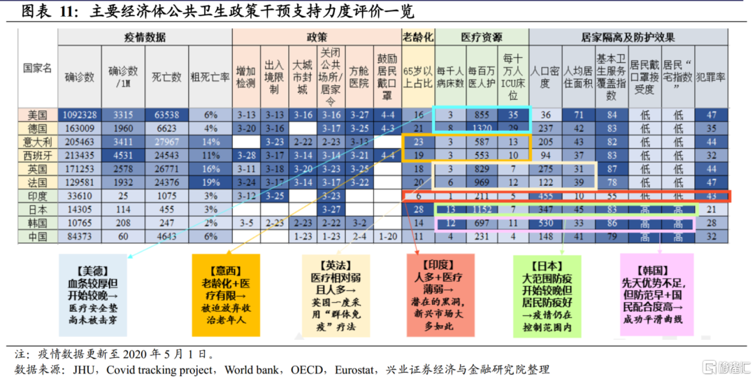 美德日:先天优势弥补后天短板。美国、德国、日本虽然从国家层面推进大规模防疫的时间相对较晚且有一定先天劣势(美国联邦制度可能导致联邦政府集中调配的权力较低,各州、城市、医院和联邦机构之间的采购竞争;欧美国家居民戴口罩意识较低;美国犯罪率相对高,存在“趁乱打劫”风险;日本人口老龄化和人口密度相对不利于防疫),但是在禀赋层面有非常突出的优势(美德医疗资源较为丰厚、人口老龄化程度相对较低、人口密度相对较低,日本基础医疗资源相对充裕且居民戴口罩配合度极高),因此疫情仍然在控制中。