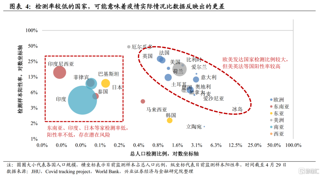 检测率显著偏低,可能意味着疫情实际情况比数据反映出的更差。如前所述,检测率刻画了总人口中检测的充分程度。一般而言,一个经济体在检测较为充分的情况下确诊数的下滑,能够比较可信地表征该国疫情比较好地受到了控制。而如果某一经济体检测率明显偏低,那么其确诊数仍不高并不意味着疫情风险不大——可能主要是因为政策尚未推动大范围检测、试剂盒供应不足、检测能力跟不上等。从这个角度,需要尤其关注菲律宾、印度尼西亚等检测率明显偏低的东南亚新兴经济体,随着检测力度上升后,未来确诊人数大幅攀升的潜在风险。