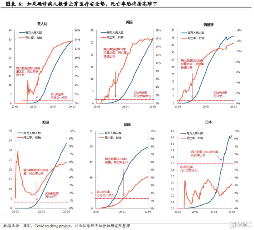 医疗资源较弱的国家,面临病人数量击穿安全垫的挑战更严峻。理论上而言,确保重症病人得到有效医治,是控制死亡率不大幅上升的关键。反之,如果确诊病人超过了医疗资源的承受能力,医疗系统崩溃,则死亡率可能快速上升。而从实际数据也可以看到,当确诊病人数量超过ICU床位数量后,死亡率往往出现快速上升——这也解释了为什么意大利、西班牙、英国死亡率显著偏高。