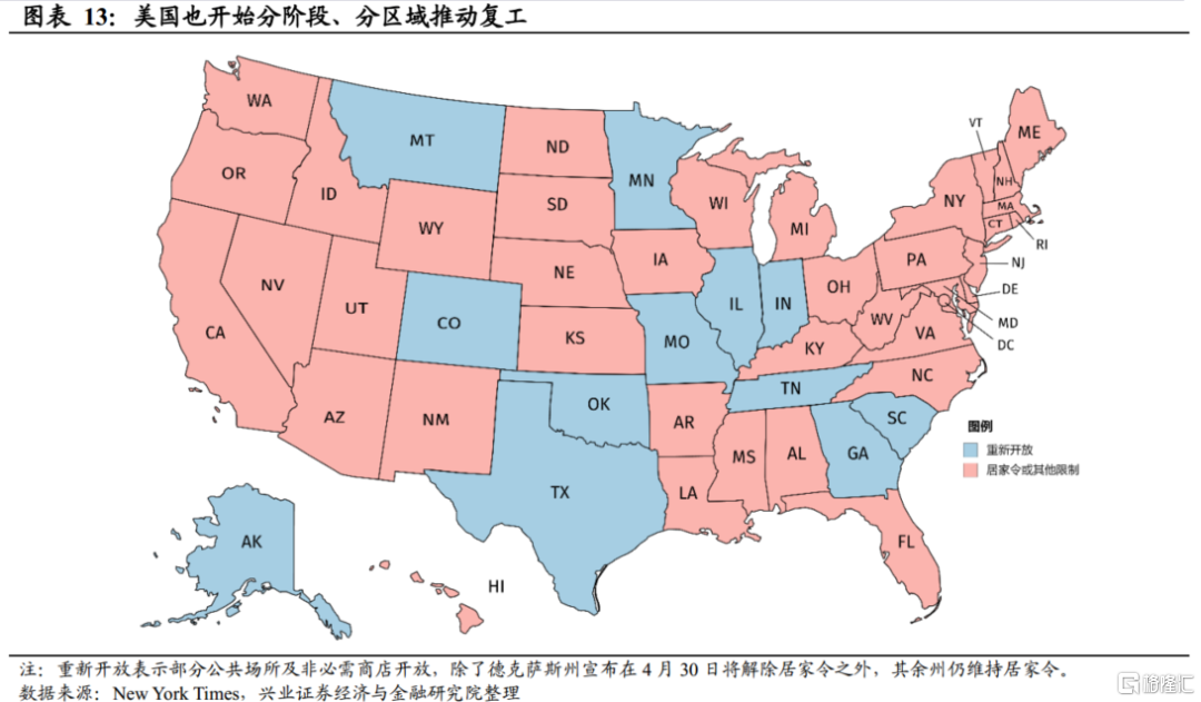 定性层面,我们跟踪了全球各国和美国各州的复产复工时间表。其中,美国总统特朗普于4月16日宣布“重启美国(Opening up America again)”计划,分成三个阶段重启美国经济,各州陆续启动复产复工。4月20日起,佐治亚等疫情相对较轻的州率先放松限制措施;自4月27日起,田纳西、俄克拉荷马、阿拉斯加等州陆续放松管制;佛罗里达、亚拉巴马、亚利桑那等州的“居家令”将于4月30日到期;纽约则将于5月15日在该州疫情风险低的地区重启部分制造产业与建筑活动。
