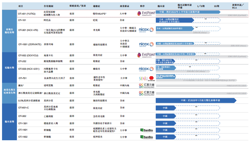 OT-101:是一种低浓度(0.01%)阿托品滴眼液,为减缓或减慢儿童及青少年近视进展而开发。根据弗若斯特沙利文的资料,阿托品是迄今为止唯一被证实在控制近视加深方面持续有效及安全的药物。