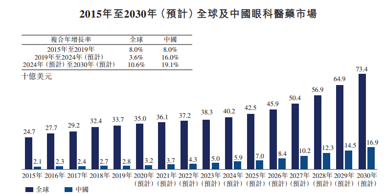 根据弗若斯特沙利文的资料,中国眼科医药市场预计由2019年的人民币194亿元增至2024年的人民币408亿元,复合年增长率为16.0%。