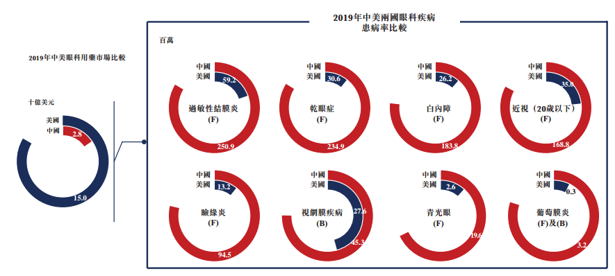 下图列示以药物治疗为主的主要眼疾在中国及美国的患病率。对比显示,中国该等主要眼疾患者人数远多于美国,而2019年中国眼科药物市场规模仅为美国的五分之一,表明中国眼科药物市场具有强大的增长潜力。