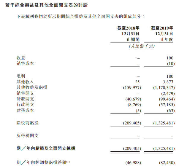 虽然欧康维视在2019年通过博鰲试验计划获得OT-401的有限销售收入19万元,但总体2018年加上2019年总亏损超过了15亿元。招股书显示,在过去的2018年和2019年,奥康维视的营收分别为0元和19万元人民币,相应的期内亏损分别为2.09亿元人民币和13.25亿元人民币。