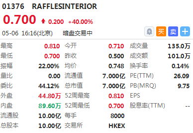 华盛资讯5月6日讯,新加坡室内装修服务供应商Raffles Interior暗盘高开逾40%,截至16:17报价0.7港元,最新成交额101万港元,总市值为7亿港元。公开配售申购人数14256,一手中签率10%,认购倍数约14.17倍。