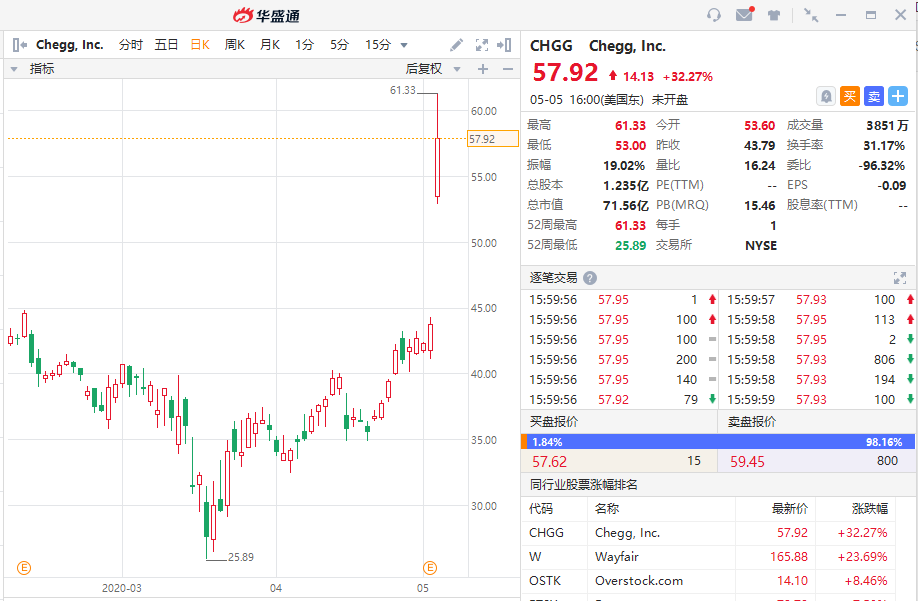 周二美股盘中,Chegg大涨32.27%,公司最新公布的财报数据显示,这家在线教育科技公司正在从公共卫生危机中获得提振。
