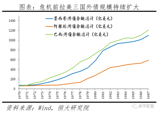 外债规模持续扩大,短债占比快速攀升,拉高债务风险。从总量看,70年代拉美各国外债规模急剧膨胀,外债余额占GDP比例持续爬升。1970年墨西哥、阿根廷和巴西三国的平均外债余额为63亿美元,而1980年平均外债余额已猛增至523亿美元,增幅高达727%。从结构看,危机爆发前拉美国家短期外债占整体外债比重快速攀升,1977-1980年,墨西哥、阿根廷和巴西三国平均短债占比由18%迅速上升至28%。债务结构的不合理进一步加重拉美国家的债务负担、拉高债务风险。