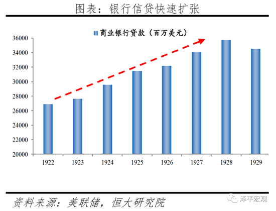 货币政策宽松,监管缺失,信贷大幅扩张,各部门杠杆率快速提升。一方面,为刺激经济增长,美联储维持宽松的货币政策,1921-1927年,贴现率由7%下调至3.5%,累计调降350BP。另一方面,自由放任主义主导下,金融监管环境宽松,商业银行混业经营,同时这一时期美国陆续通过《联邦储备法》修正案及《麦克登法案》,促进甚至鼓励银行对农业、证券业等发放贷款。货币政策的宽松和监管的缺失极大刺激了消费信贷、房地产信贷扩张,信用严重膨胀,各部门杠杆率急剧上升,美国总体债务率在20世纪30年代初达到近300%的历史高点。