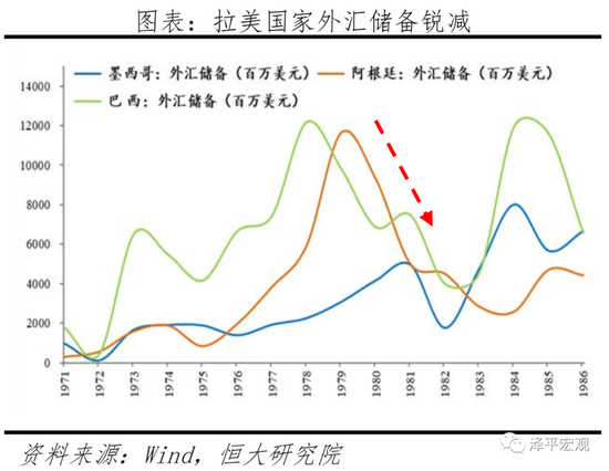 国际资金加速流出,加剧拉美地区资金短缺局面。美国高利率政策下,国际金融市场利率攀升,诱发大量国际资金从拉美地区流出,国际资本流动方向逆转,加重拉美资金短缺局面。1980-1982年,墨西哥、阿根廷、巴西三国外汇储备均值由68亿美元大幅下滑至34亿美元。