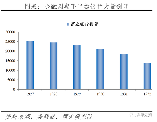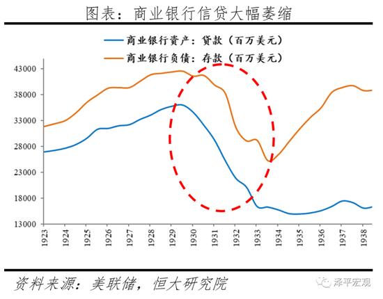银行业危机爆发,银行大量破产,信用持续收缩,加剧实体经济萧条程度。从资产端看,股市价格快速下跌、坏账大量产生,银行资产质量大幅下滑,资产缩水风险上升。从负债端看,存款人和投资人对银行的信心动摇,发生恐慌性挤兑,银行流动性短缺,融资困难。同时,1931年美联储做出提高贴现率的错误决策,市场利率快速攀升,加剧外部冲击程度。1929-1933年,银行破产数量维持高位,信贷投放量大幅萎缩,作为金融中介的资金融通功能丧失。银行信贷紧缩、股市崩盘导致居民部门消费、企业部门投资快速下降,实体经济进一步陷入萧条的泥沼。