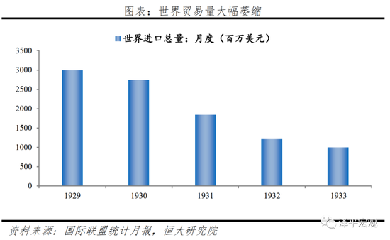 美国大萧条带来的冲击通过贸易战、金本位两条主要渠道向全球扩散。一方面,美国提高关税,引发全球贸易战。出于保护国内部分产业、缓和大萧条经济冲击以及金本位制约货币政策使用等主要原因,1929年美国国会通过《斯姆特-霍利关税法》,施加自1830年来100年内美国最高关税,将平均关税水平由40%提高至47%。此举引发全球贸易大战,各国竞相报复性提高关税,甚至施加进口配额限制、投资限制、竞相汇率贬值,导致国际贸易状况严重恶化。另一方面,一战后主要国家普遍重建金本位制度,黄金大量流入美国,其他国家货币供应量相应减少,通货紧缩快速蔓延,加剧全球经济的衰退程度。