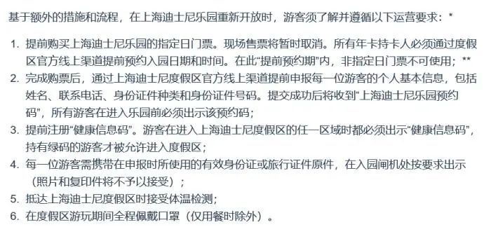 在恢复运营初期,上海迪士尼乐园将实施一系列新的运营举措和流程,包括实行限流、要求游客提前购票及预约入园;在乐园的排队区域、餐厅、游乐项目和其他设施,保障安全距离;以及增加卫生消毒的频次等。