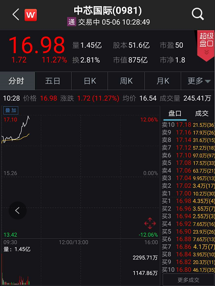 消息发布后,资本市场率先反应。5月6日,中芯国际港股开盘大涨超5%以上,盘中一度涨超12%以上,市值猛升94亿港元。A股芯片概念股涨声一片,其中科创板安集科技涨停,相关概念股也掀起一波涨停潮。