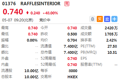 华盛资讯5月7日讯,新加坡室内装修服务供应商Raffles Interior首日挂牌高开48%,截至9:26报价0.74港元,最新成交额1705万港元,总市值为7.4亿港元。昨日暗盘中高开逾40%,最终收涨36%,一手赚1440港元。公开配售申购人数14256,一手中签率10%,认购倍数约14.17倍。