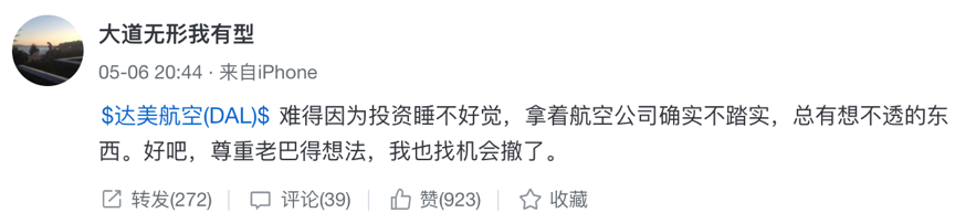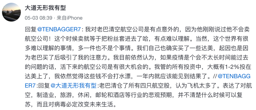 事实上,段永平这波操作确实很不“价值投资”,因为他在5月3日还回复网友称“我管的所有投资中,大概有1-2%投在达美上了,我依然觉得这些钱不会打水漂,一年内就应该能见到结果了。”