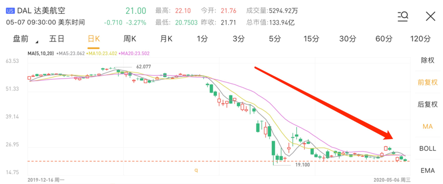 达美航空的股价,从疫情前的62美元跌至21美元,跌幅已经超过66%。