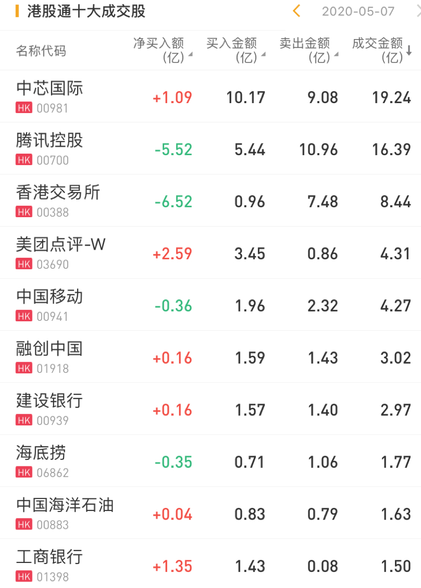 今日净买入中芯国际1.09亿港元,净买入美团点评2.59亿港元,净买入工商银行1.35亿港元。腾讯控股遭净卖出5.52亿港元,香港交易所遭卖出6.52亿港元。