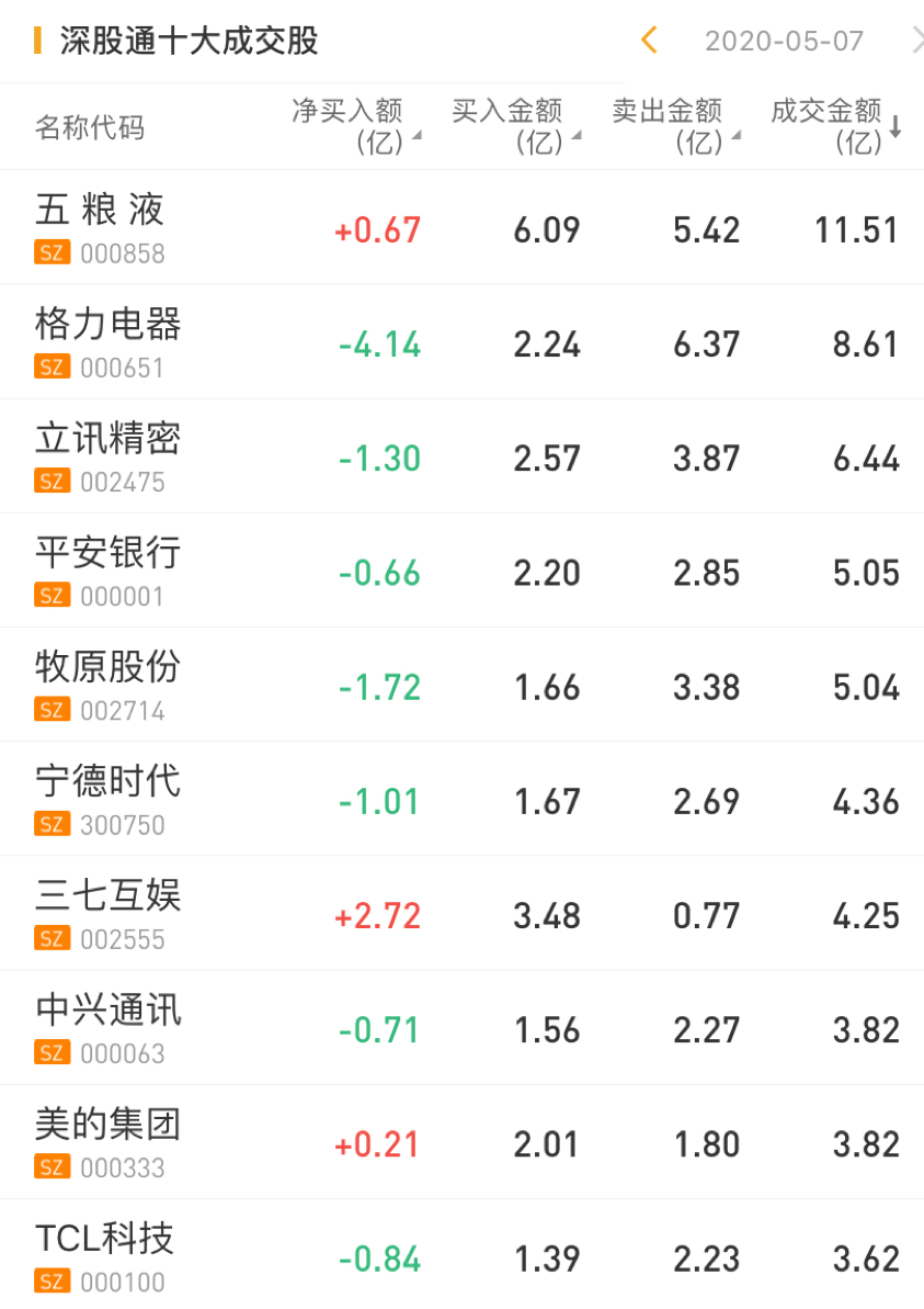 深股通净卖出格力电器4.14亿元,净卖出立讯精密1.30亿元,净买入三七互娱2.72亿元。