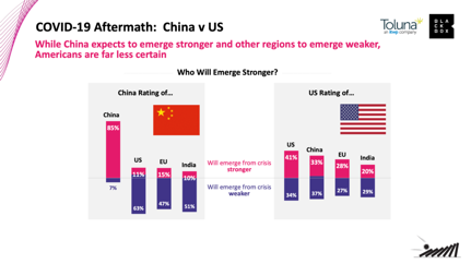 报告结果还显示,中国在走出危机方面比美国显示出了更强的信心:85%受访的中国人认为,中国在疫情过后会更强大,而只有41%的美国民众认为美国会变得更加强大。