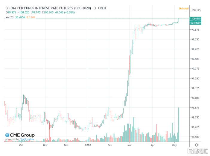 需要解释的是,联邦基金期货的票面价值与隐含利率存在换算的关系,价格基差为100减去交割月日均参考利率。换句话说,该合约破百意味着市场预测该月基准利率将为负值。
