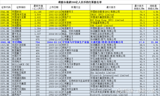 1. 既然是红筹公司,必须得国资持股35%以上(红筹的另外3个标准是:来自中国的营收占比超过55%、注册在中国大陆以外地区、在香港交易所上市),所以直接Pass了市值超过2000亿、但出身不够根正苗红的中资民营股,比如腾讯、美团、小米。