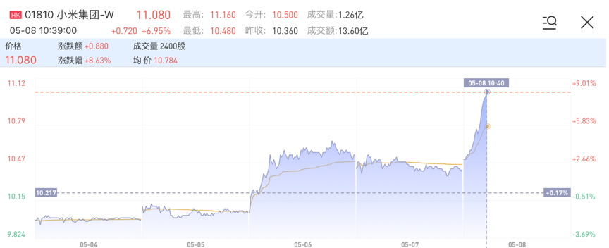 华盛资讯5月8日讯,受西欧手机出货量大涨讯息利好,小米集团-W(01810)盘中一度涨近9%。截至发稿,小米大涨6.95%,现报11.08港元,当前成交额13.60亿港元,总市值为2670亿港元。