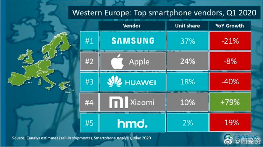 Canalys数据显示,第一季度,小米在西欧智能手机市场出货量同比增长79%,市场份额达到10%,也是该市场份额前五的品牌中唯一取得同比正增长的。分国家来看,小米西班牙出货量同比增长46%,市场份额为28%;德国出货量市场份额为6%;意大利出货量同比增长306%,市场份额为16%;法国出货量同比增长83%,市场份额为11%。