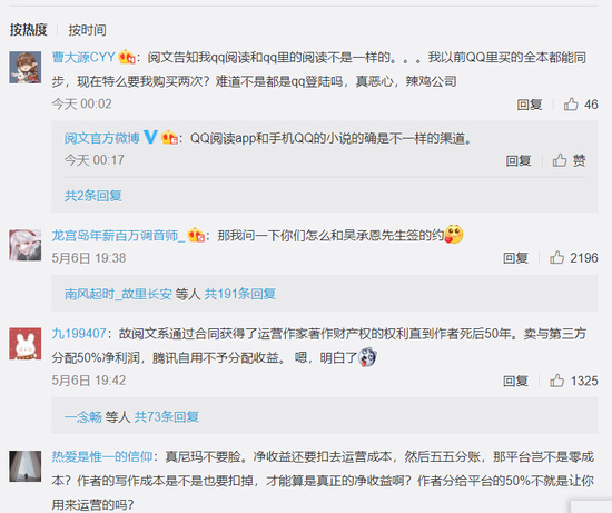 不过,阅文官微下面仍然是一片骂声,“阅文告知我qq阅读和qq里的阅读不是一样的。。。我以前QQ里买的全本都能同步,现在特么要我购买两次?难道不是都是qq登陆吗,真恶心,辣鸡公司”。