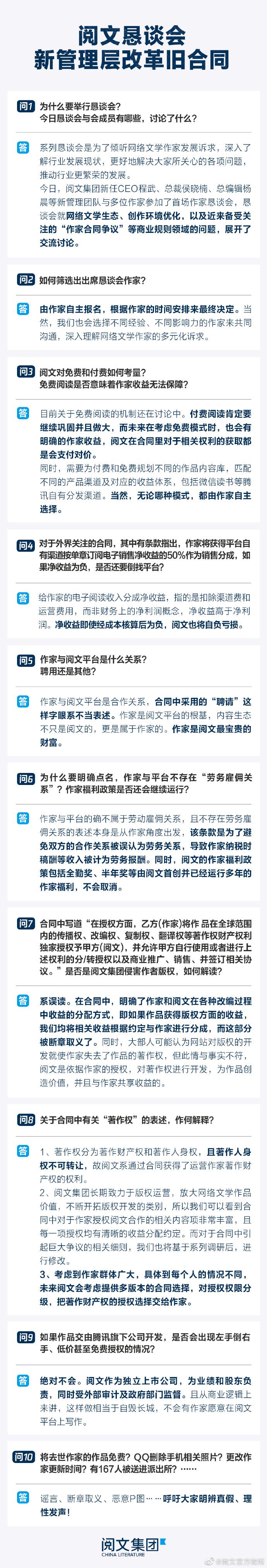 5月6日,阅文召开恳谈会,阅文新管理层改革旧合同,将明确著作人身权归属作家、财产权的收益规则,免付费模式由作家选择。