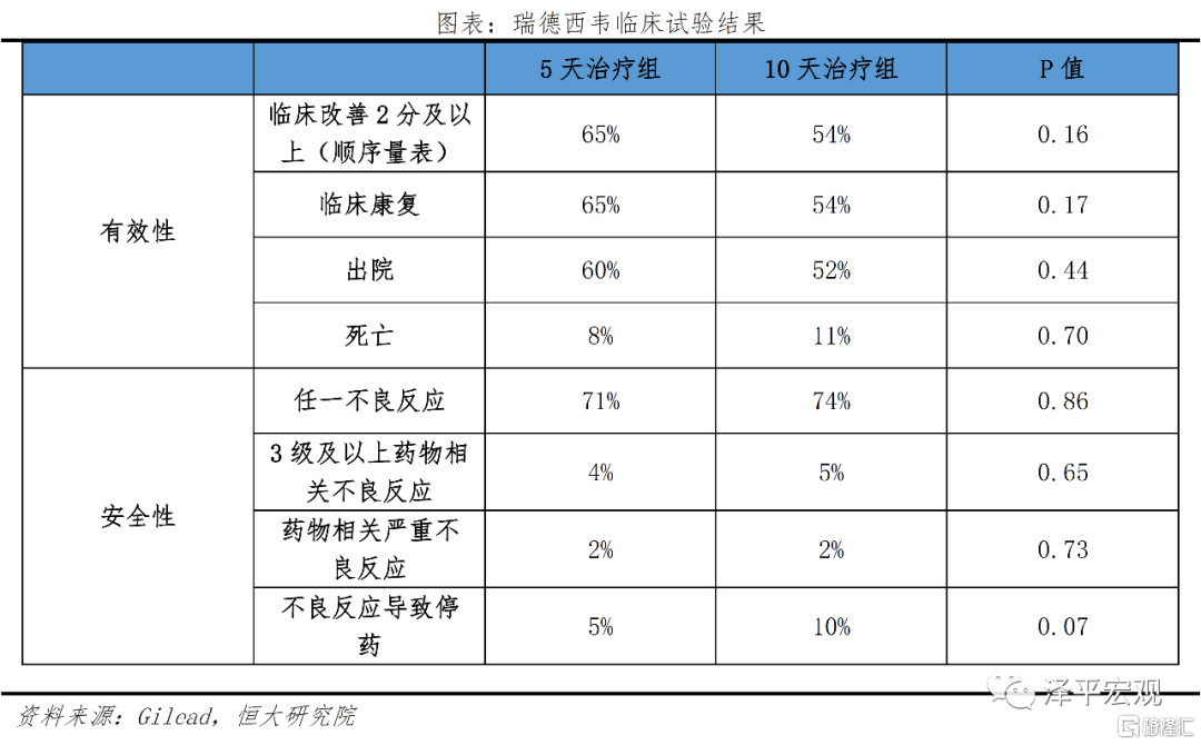 药物方面,目前针对新冠肺炎的药物研发分为抗病毒药、中和抗体和抑制细胞因子风暴药物三类,瑞德西韦临床试验结果预示短期内无特效药。抗病毒药方面,此前瑞德西韦被认为最有希望,4月29日,吉利德公布了瑞德西韦的一项开放标签临床试验结果,表明瑞德西韦对新冠肺炎有治疗效果,且5天治疗比10天治疗更有效,但重症病死率在8%-11%左右,说明瑞德西韦并不是特效药。对于瑞德西韦的确切疗效,预计将在其正在进行中的双盲随机对照临床试验结束后明确。中和抗体和抑制细胞因子风暴药物方面,已有至少10余个中和抗体和抑制细胞因子风暴候选药物处于研发阶段,有望降低新冠肺炎重症的死亡率,但短期内难以研发成功。