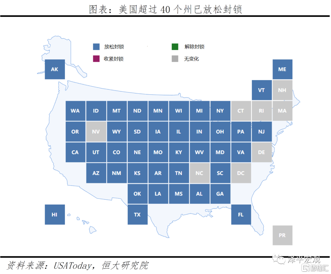 除日本外,发达经济体大部分已经或即将放松封锁措施,正在逐步复工。欧洲方面,4月底德国率先在部分州开始放松封锁,5月4日意大利放松封锁并有超过440万人复工,法国和西班牙则计划于5月中下旬放松封锁;美国方面,特朗普于4月中旬提出放松或解除封锁的“三步计划”,4月下旬陆续有部分州放松封锁措施,目前已有超过40个州放松了封锁,正在逐步复工。但日本由于二次爆发,目前的封锁措施将至少持续至5月底。