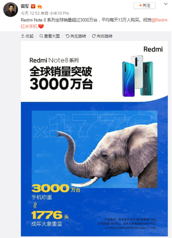 在这条销量数据的微博中,雷军还特别选用了一张大象配图,意思是,3000万台手机称重,相当于1776头成年大象重量,足见手机销量惊人。