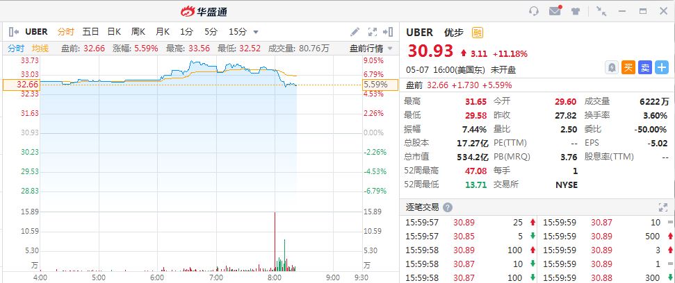 Uber(UBER.US)盘前涨超5% 一季度外卖服务营收同比大增53%